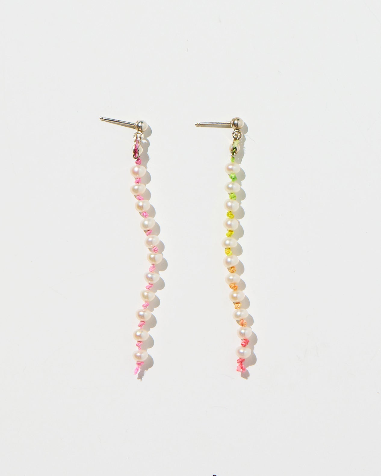 Luminous freshwater pearls knotted on hand dyed rainbow colored silk. No two pairs are the same just like rainbows which they are named after.