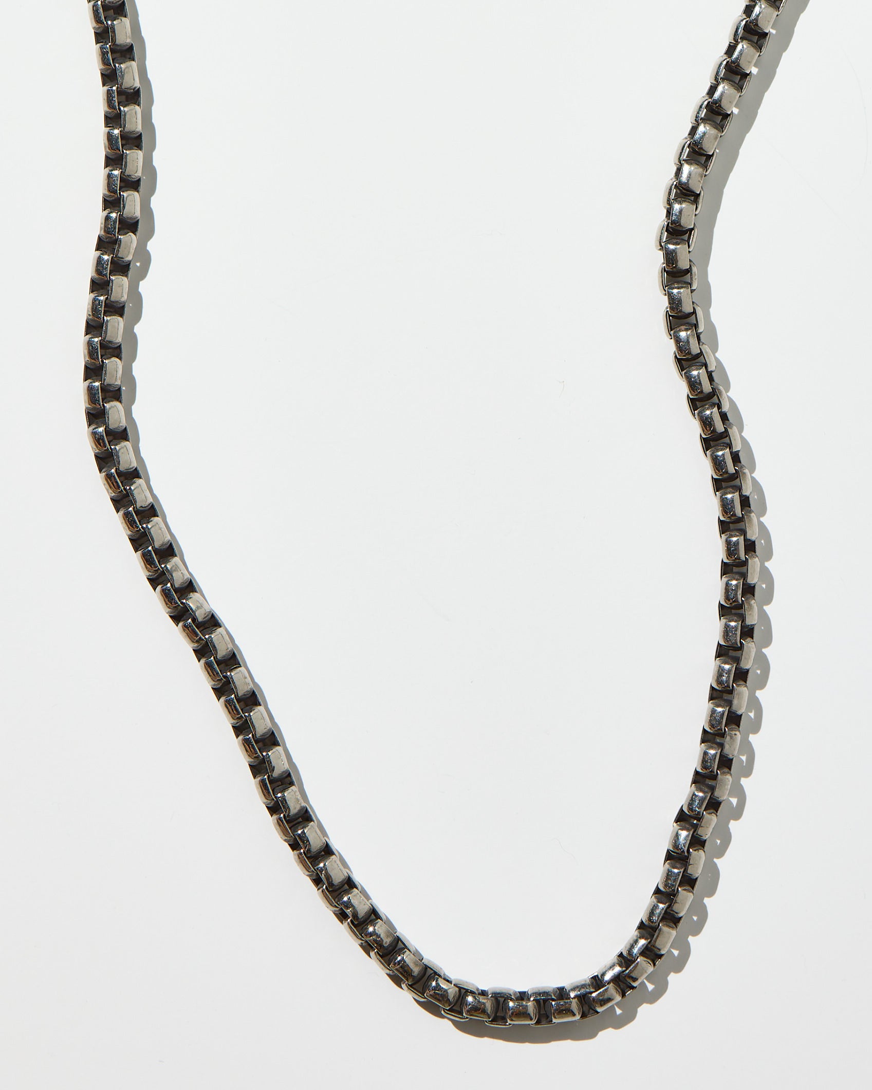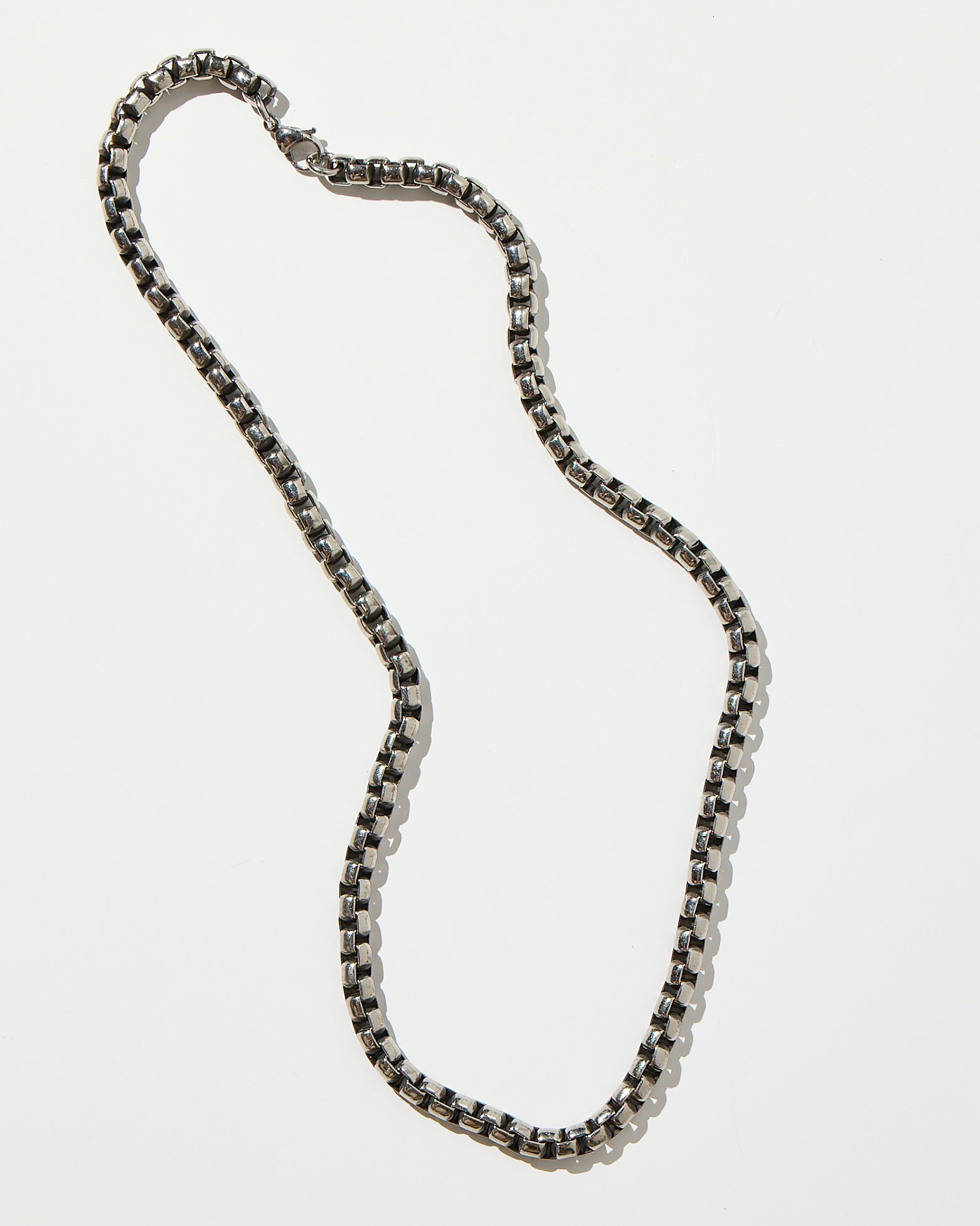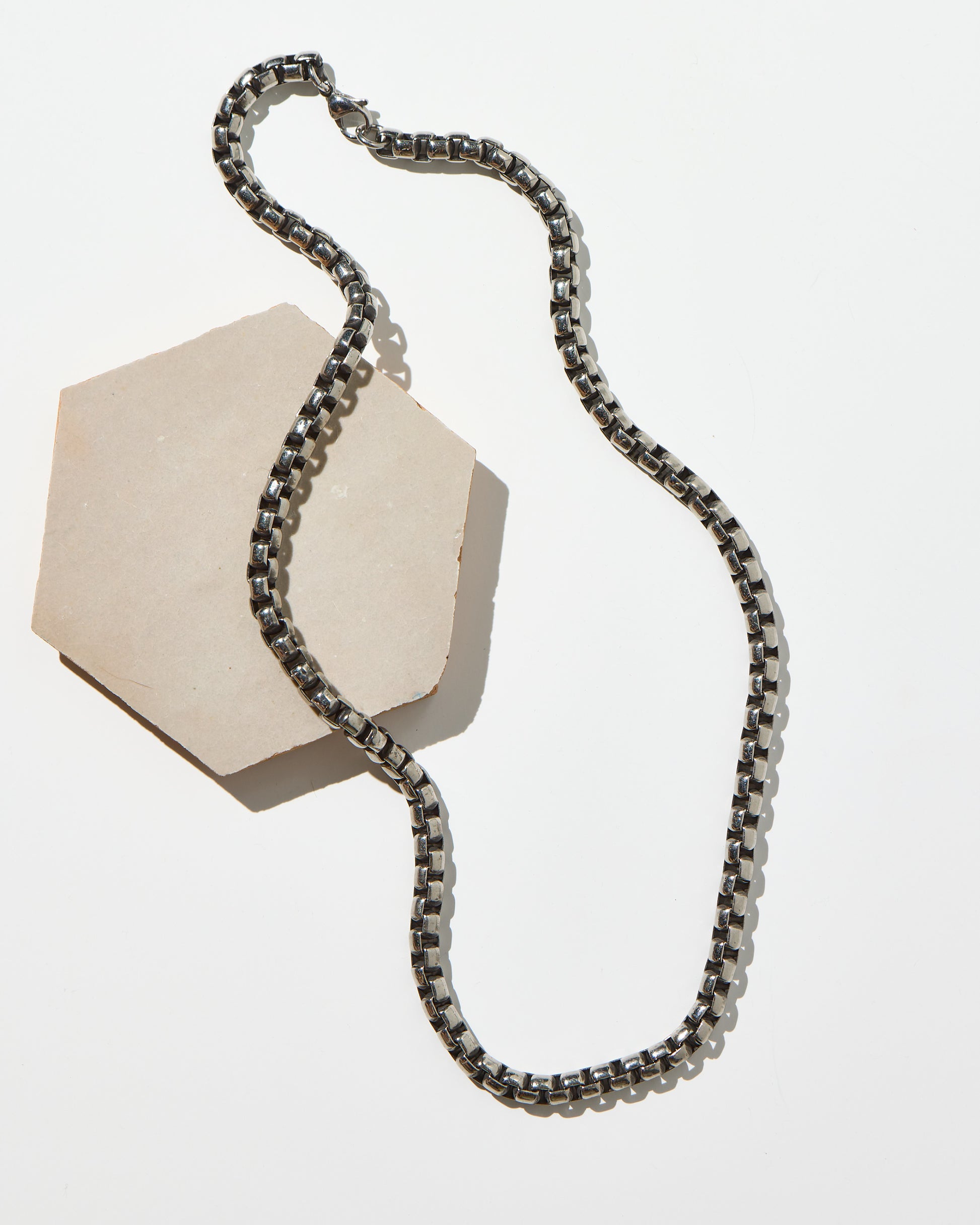 Edgy and unrestrained, this chunky rhodium chain makes an unapologetic statement. With squared, industrial-style links and a high-shine gunmetal finish, it channels pure rock-and-roll energy. Heavy in presence yet sleek in design, it’s the kind of piece that holds its own—whether worn solo as a centerpiece or layered for maximum impact.