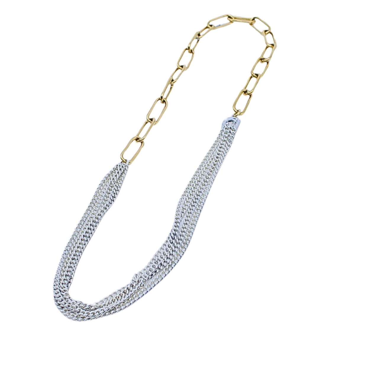 Our Emma necklace is a stunning chunky mixed metal necklace that blends sophisticated style with a hint of playful edge. Crafted with an eye for detail, this piece combines the warmth of gold with the cool allure of silver. It’s bold yet versatile, easily elevating any outfit from a simple tee to a sleek suit. Whether you’re out to make a memorable first impression or simply add a touch of glamour to your day, this mixed metal beauty has you covered.