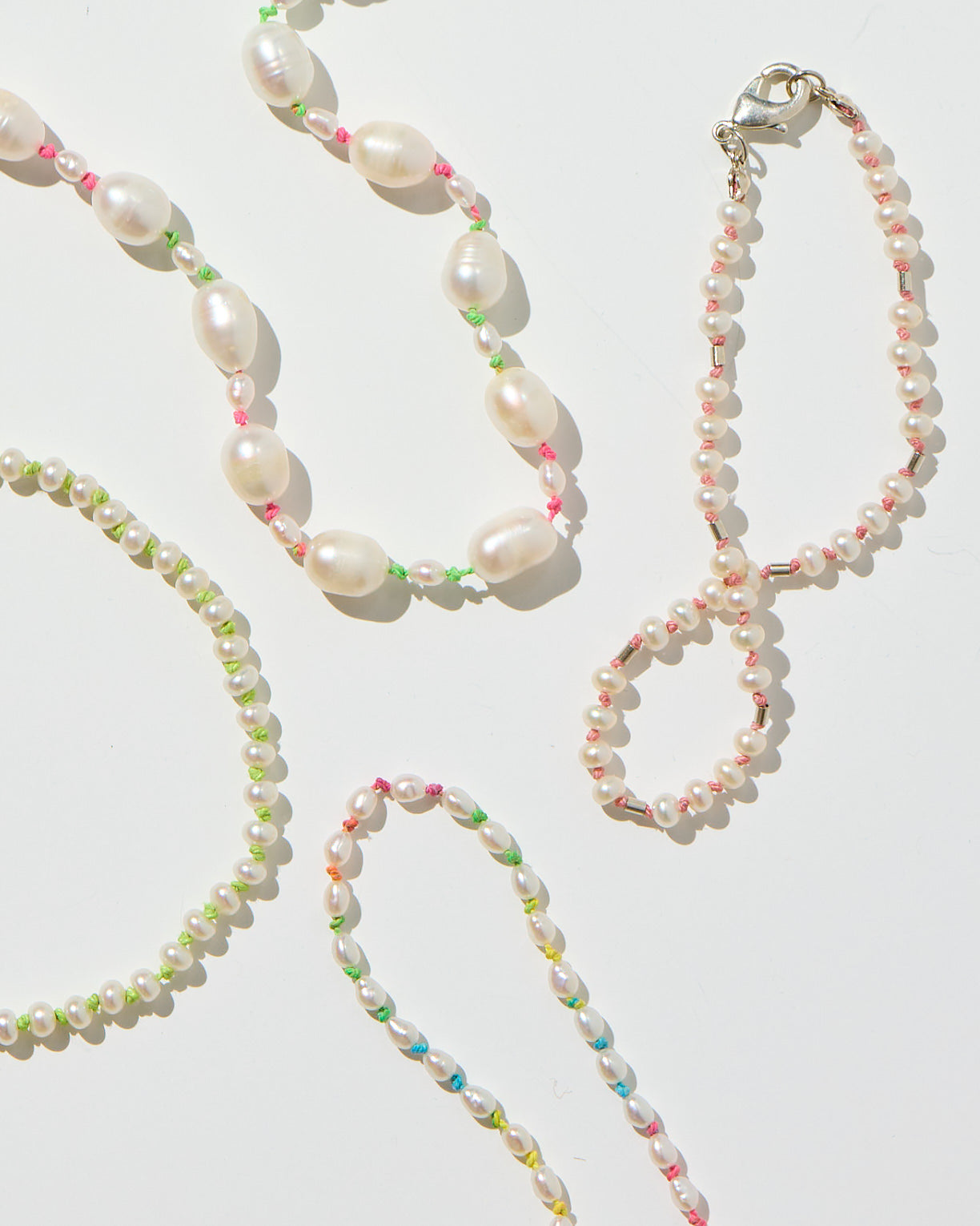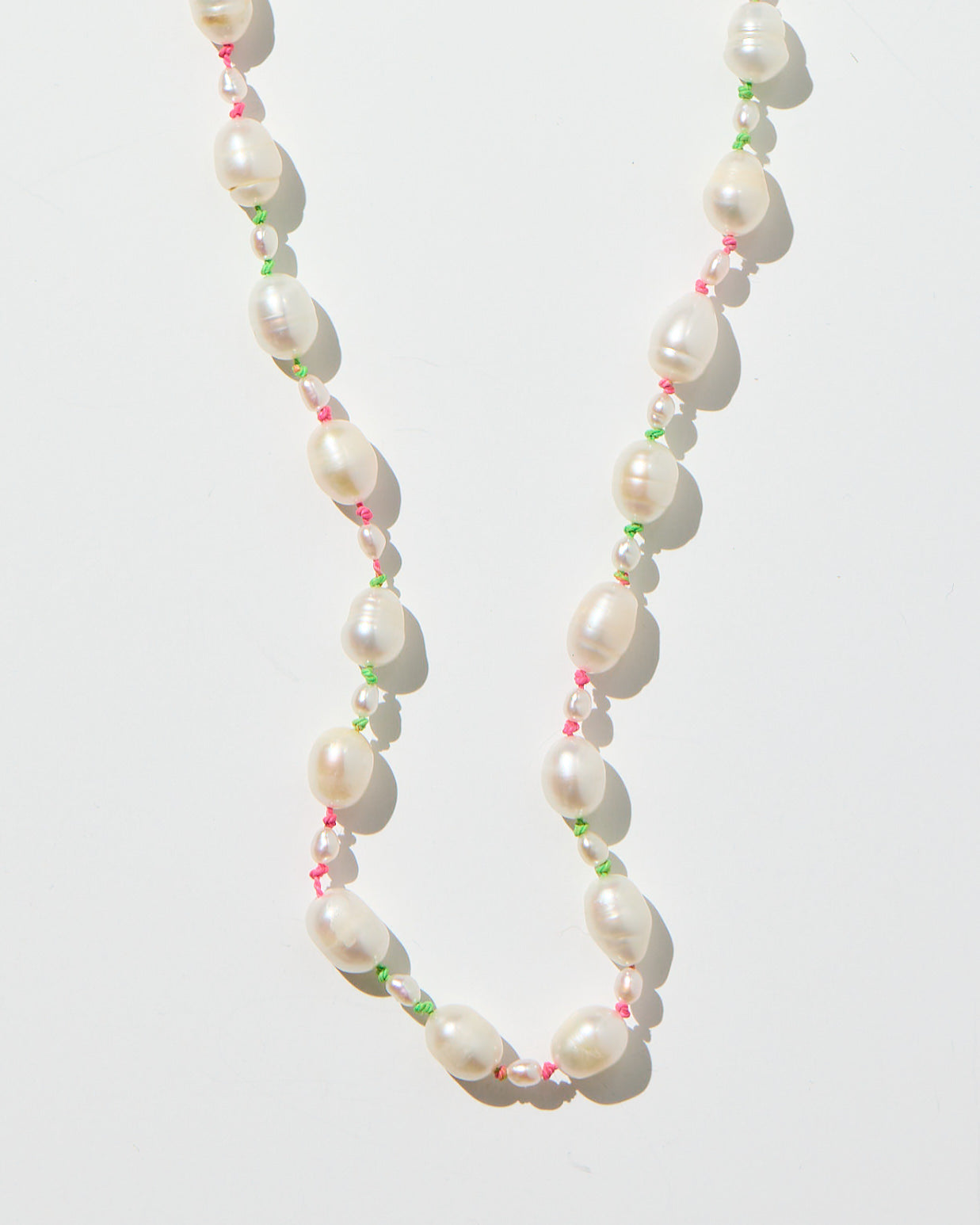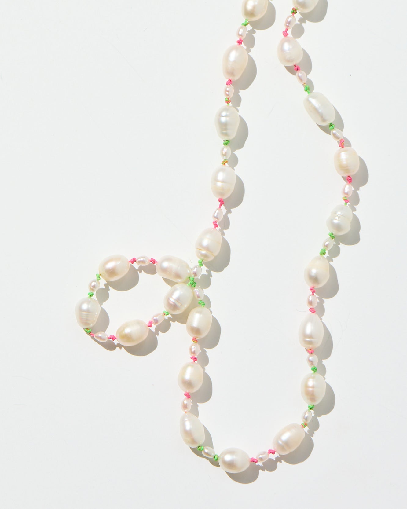 Luminous freshwater pearls hand knotted on custom silk thread. Alternating large and small pearls knotted on a vibrant kelly green and fuchsia hand dyed silk cord this one of a kind necklace is the perfect mix of uptown refinery and downtown edge.