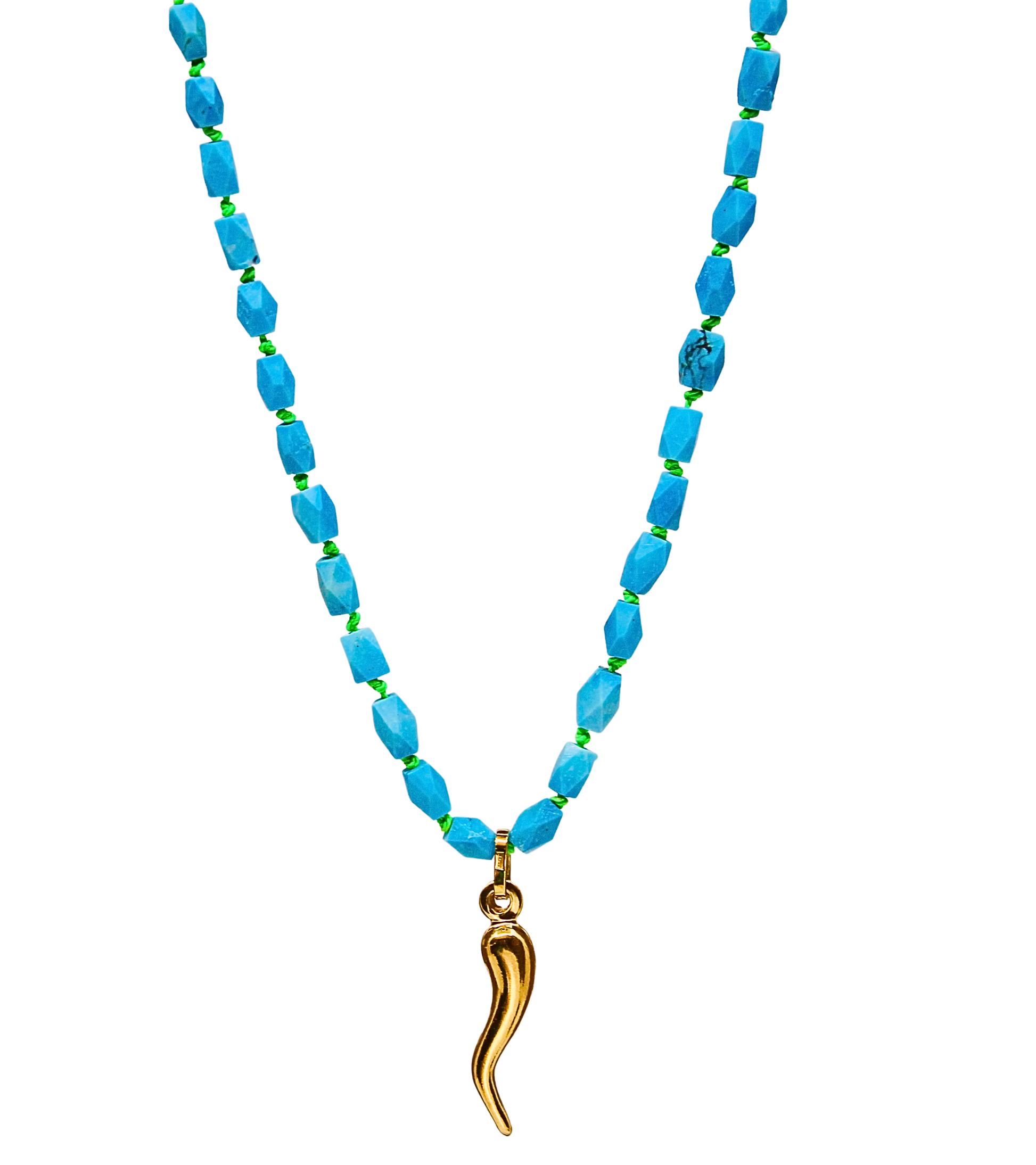 La Fortuna is good fortune worn around your neck. She pairs the protective power of turquoise with an Italian corno charm-believed to ward off the evil eye and attract good fortune. Each stone is hand knotted on electric green silk, adding an unexpected bolt of color and charm.