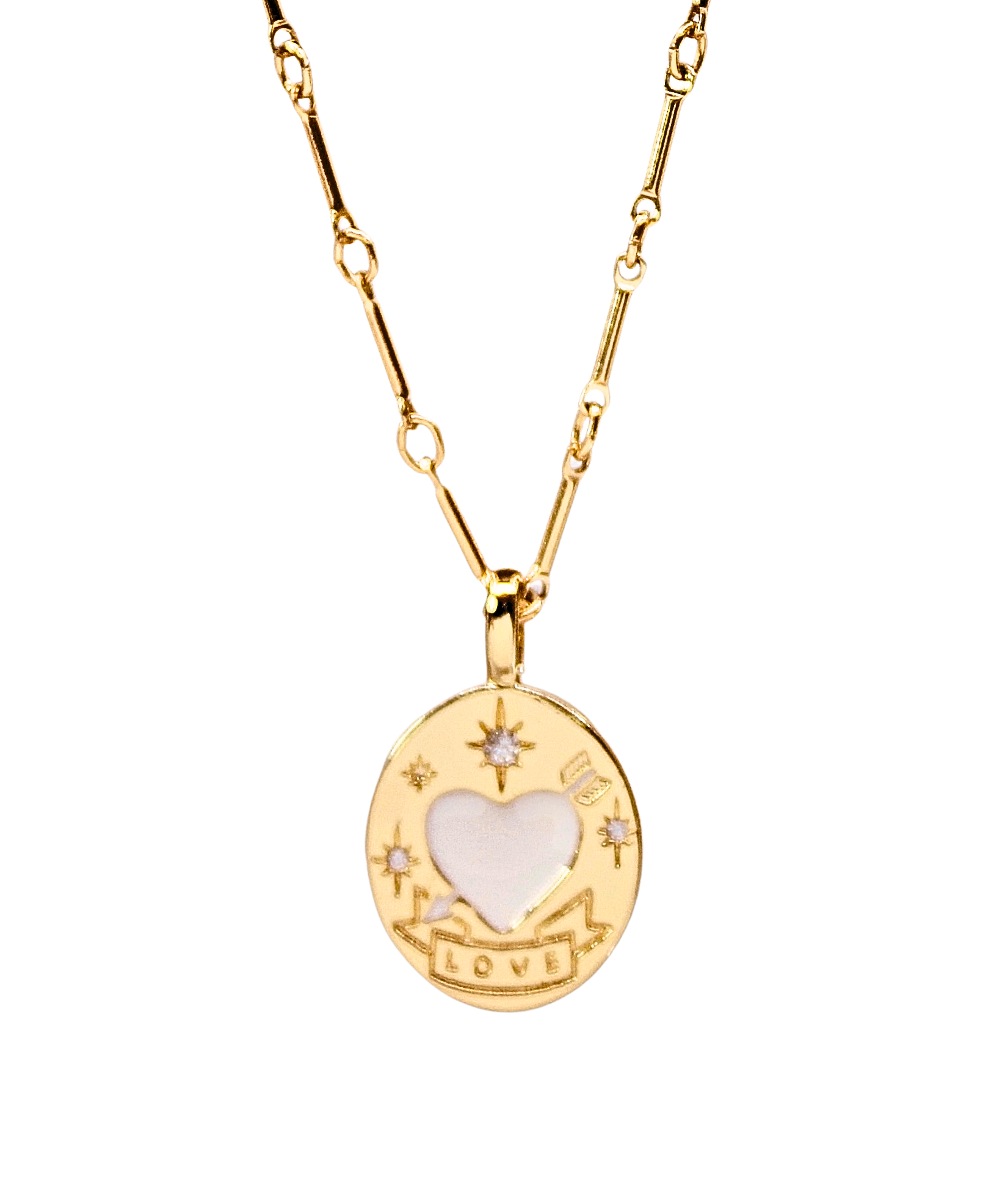 The Love Pendant is a timeless symbol of connection and devotion. Featuring a delicate heart in your choice of black or white epoxy enamel, it shimmers with tiny white crystals a subtle yet radiant tribute to love in all its forms.
