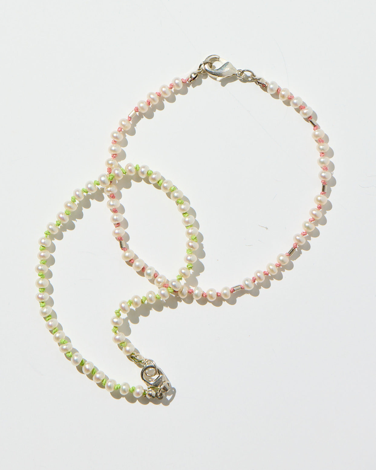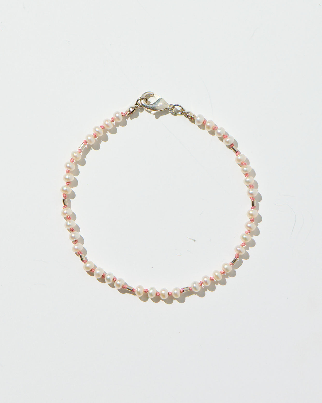 Small freshwater pearls are hand-knotted on blush pink silk, their soft glow enhanced by the shimmer of sterling silver beads. Delicate and modern, this bracelet balances classic pearls with a playful touch of contrast—perfect for layering or wearing as a subtle everyday statement.