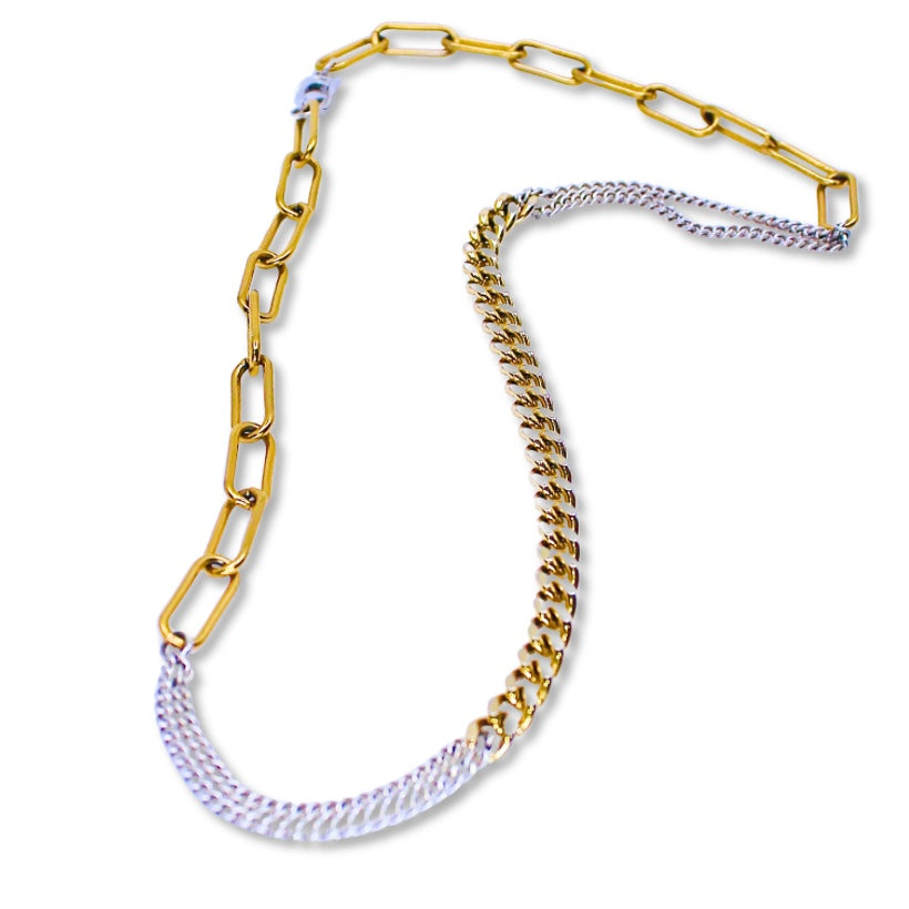 Three chunky chains in mixed metals the perfect one and done statement necklace.