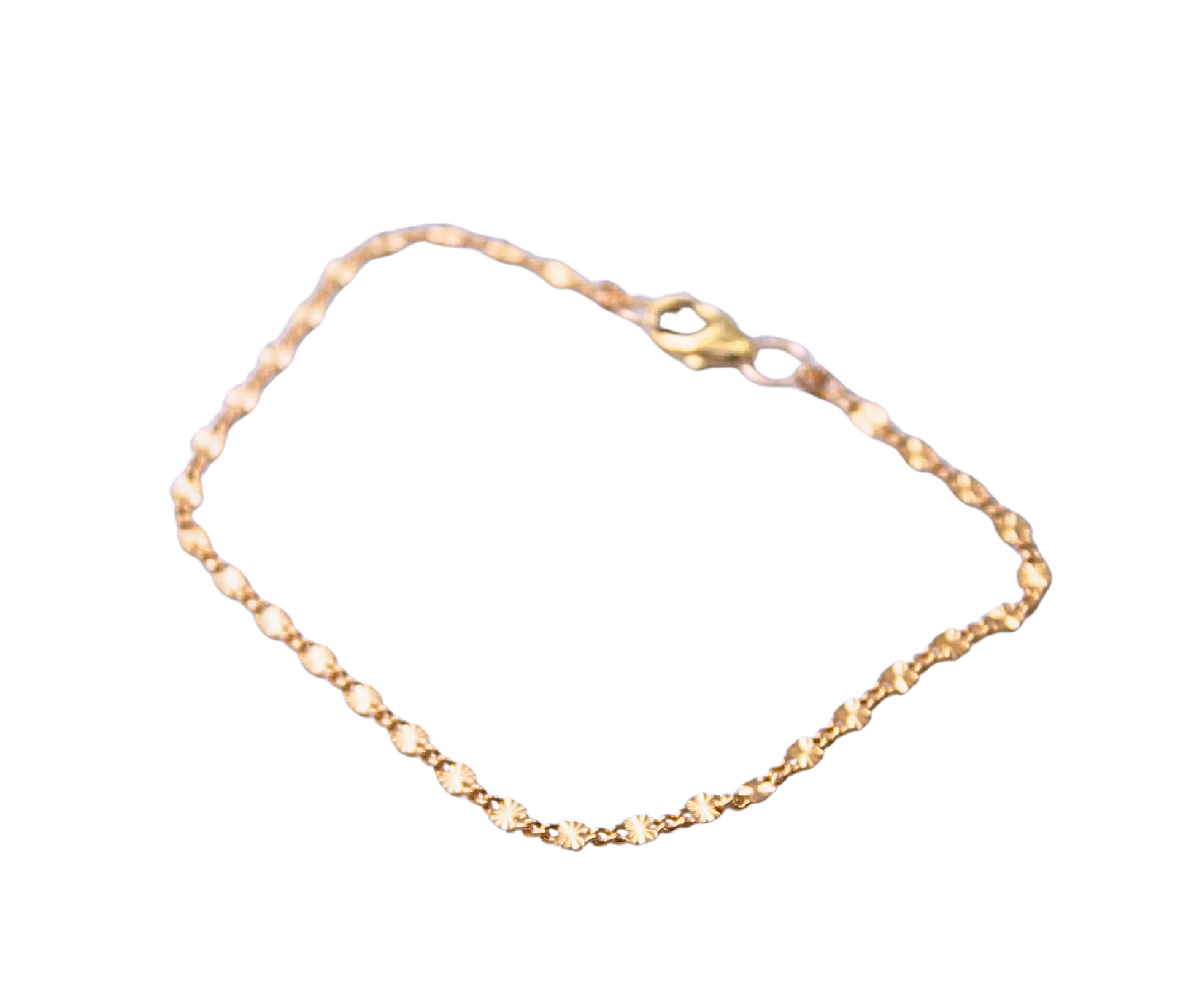 A dainty chain with a beautiful starburst pattern that catches that reflects light in a beautiful and subtle way. Perfect on its own or layered with your other favorite bracelets.