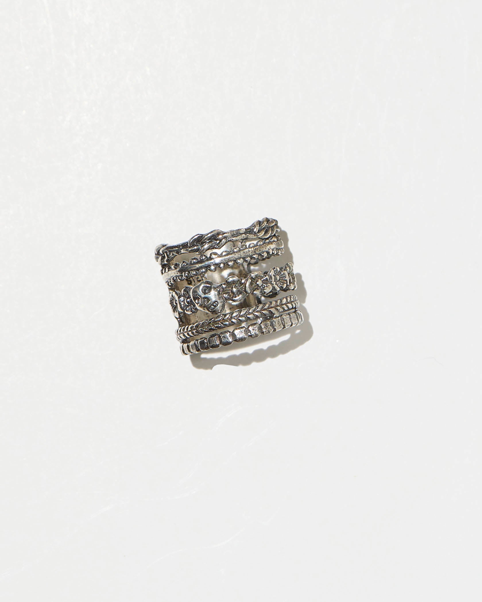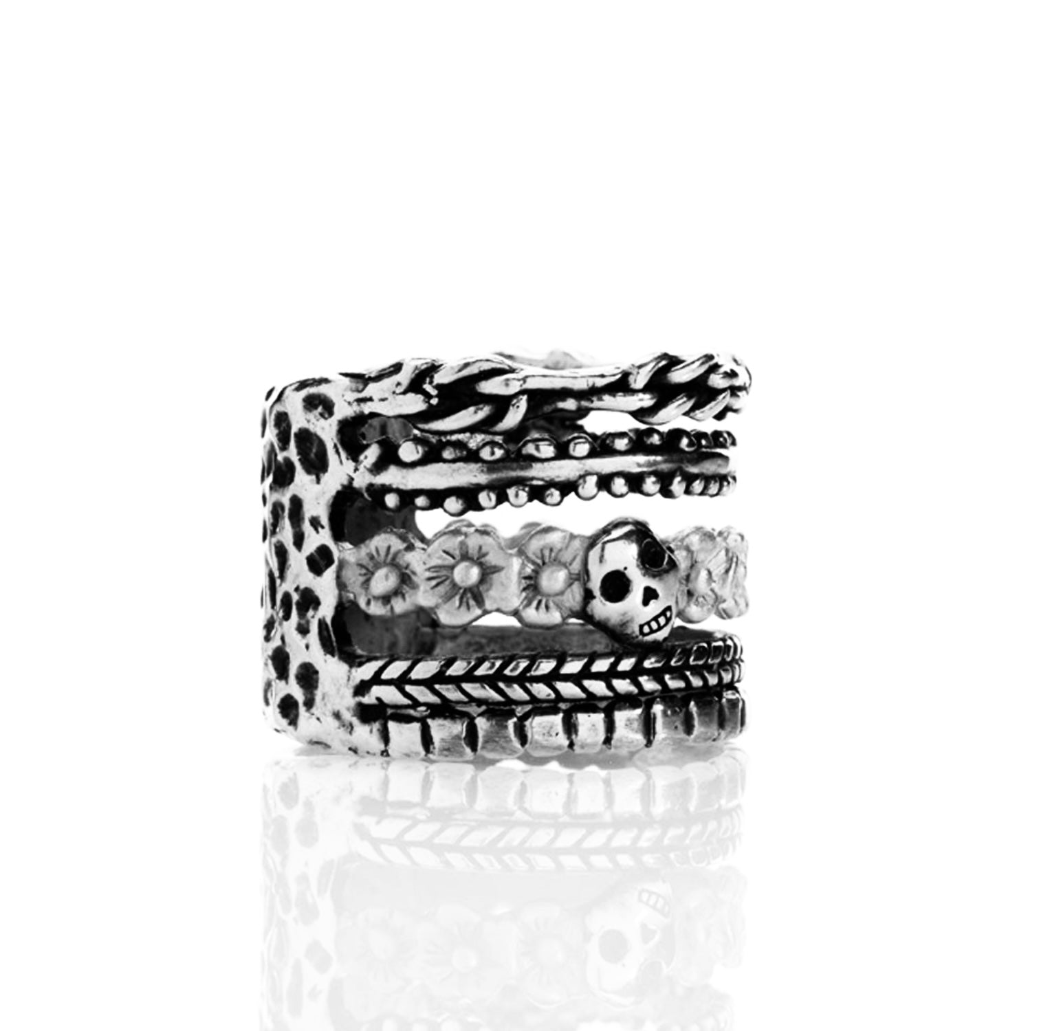 The perfect duality of tender and tough all in one striking ring. A tiny skull imbedded in a row of daisies stacked along patterned rows of silver.