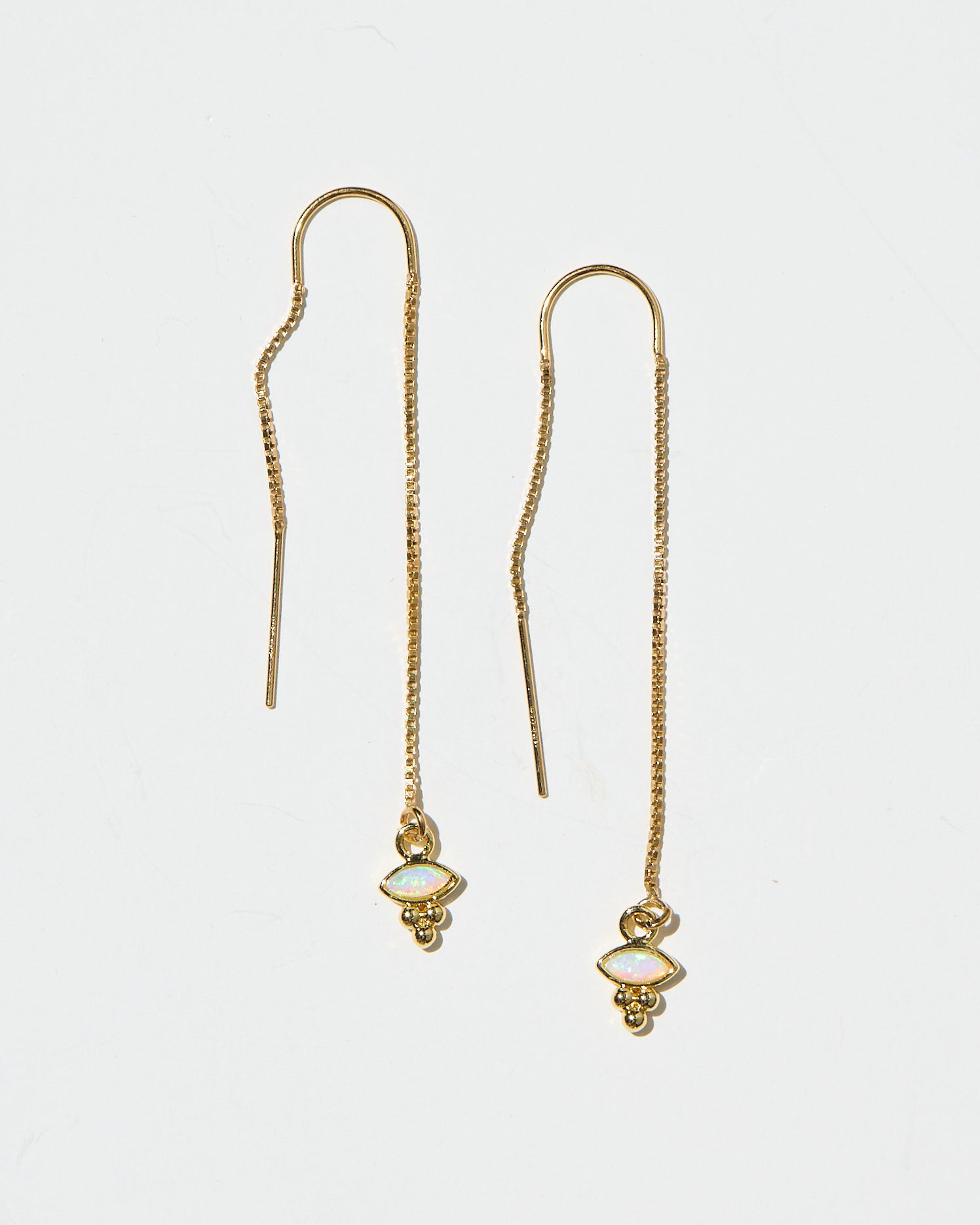 Delicate yet striking, these threader earrings are finished with glowing opals that shimmer with soft iridescence. The slender chain slips gracefully through the ear, creating a fluid line that feels both modern and timeless. Lightweight and endlessly versatile, they add just the right touch of light and movement to any look.