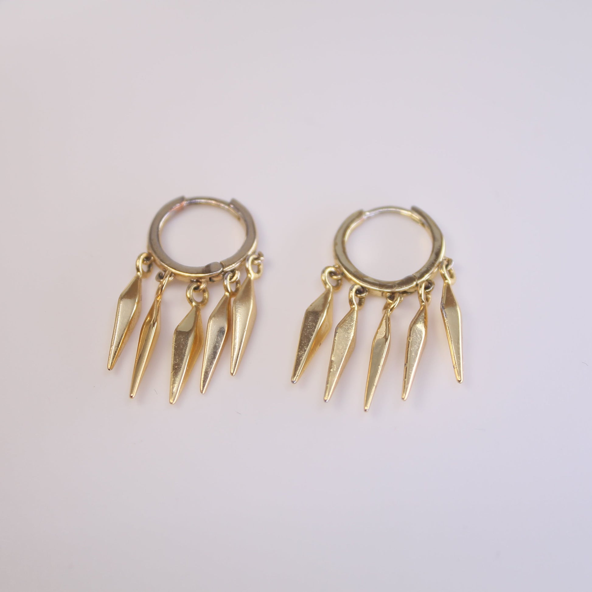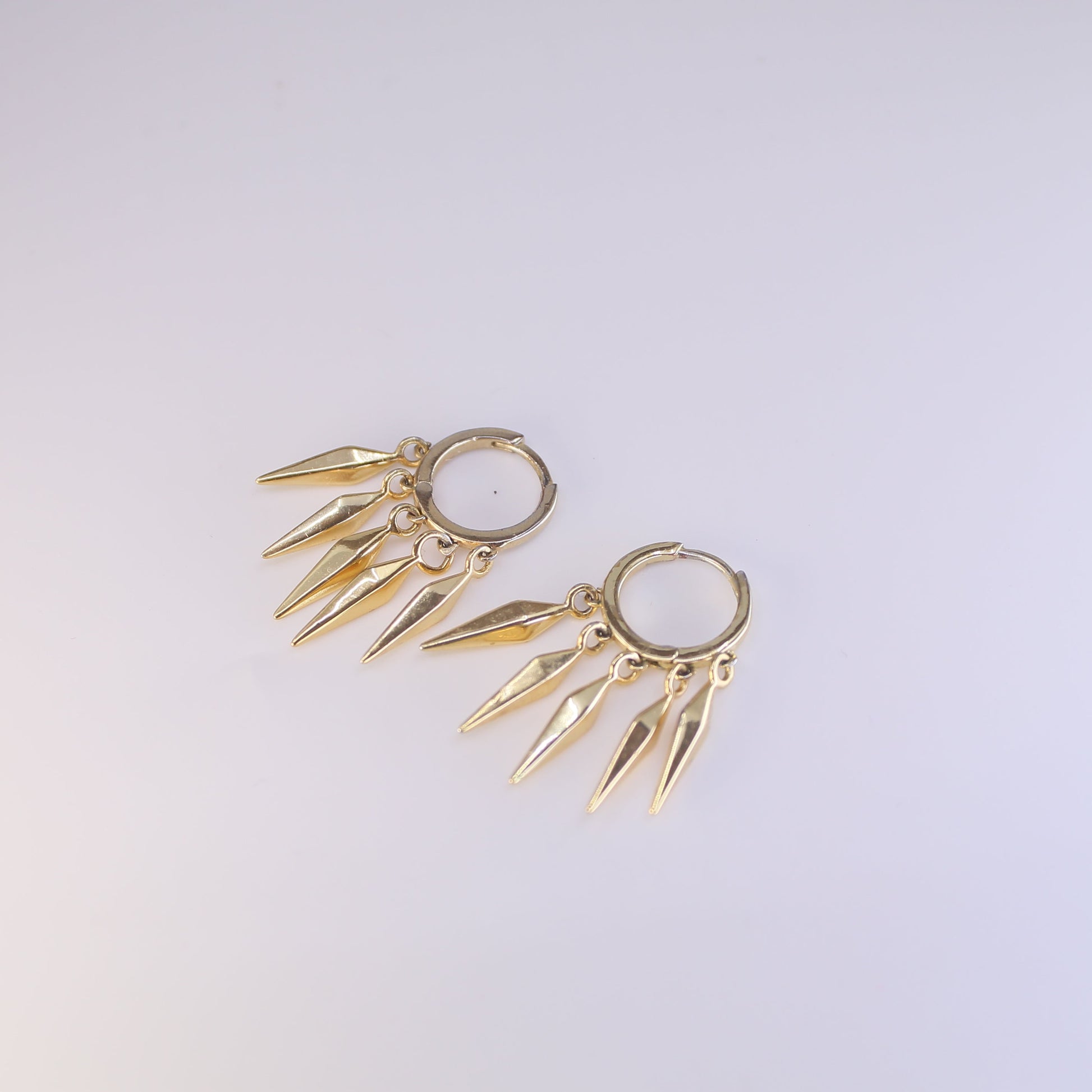 Infuse your look energy with these gold hoop earrings adorned with dangling rhombus-shaped charms. Each geometric charm is meticulously designed to catch the light as they move, creating a mesmerizing effect with every move. Lightweight yet impactful, these hoops are perfect for those who love jewelry that makes a statement through motion and shine.