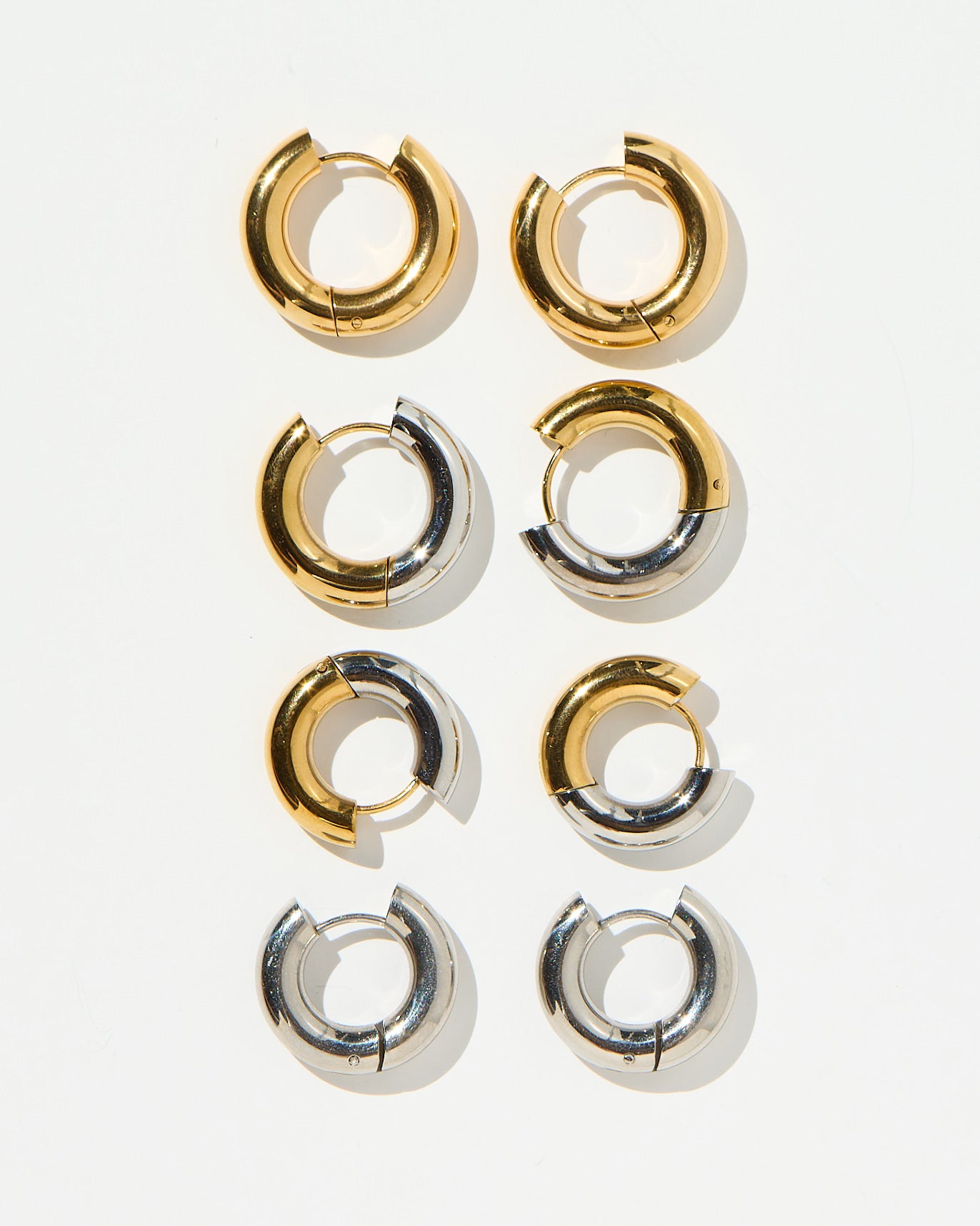 The hoops you will reach for everyday. Our Mama and Baby Chubs have a two toned palette of warm gold and cool silver, designed to be worn reversible so you can show off one metal or both. Mama Chubs are 16mm across and the Baby Chubs are 12mm across.
