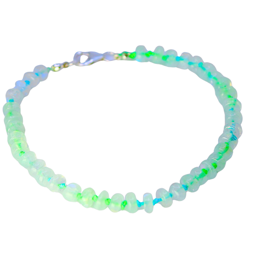 A delicious mix of shimmering translucent rainbow tinged moonstones accented with hand knotted and dyed green and blue thread. A statement on its own or the perfect pop of color to add to your wrist stack.