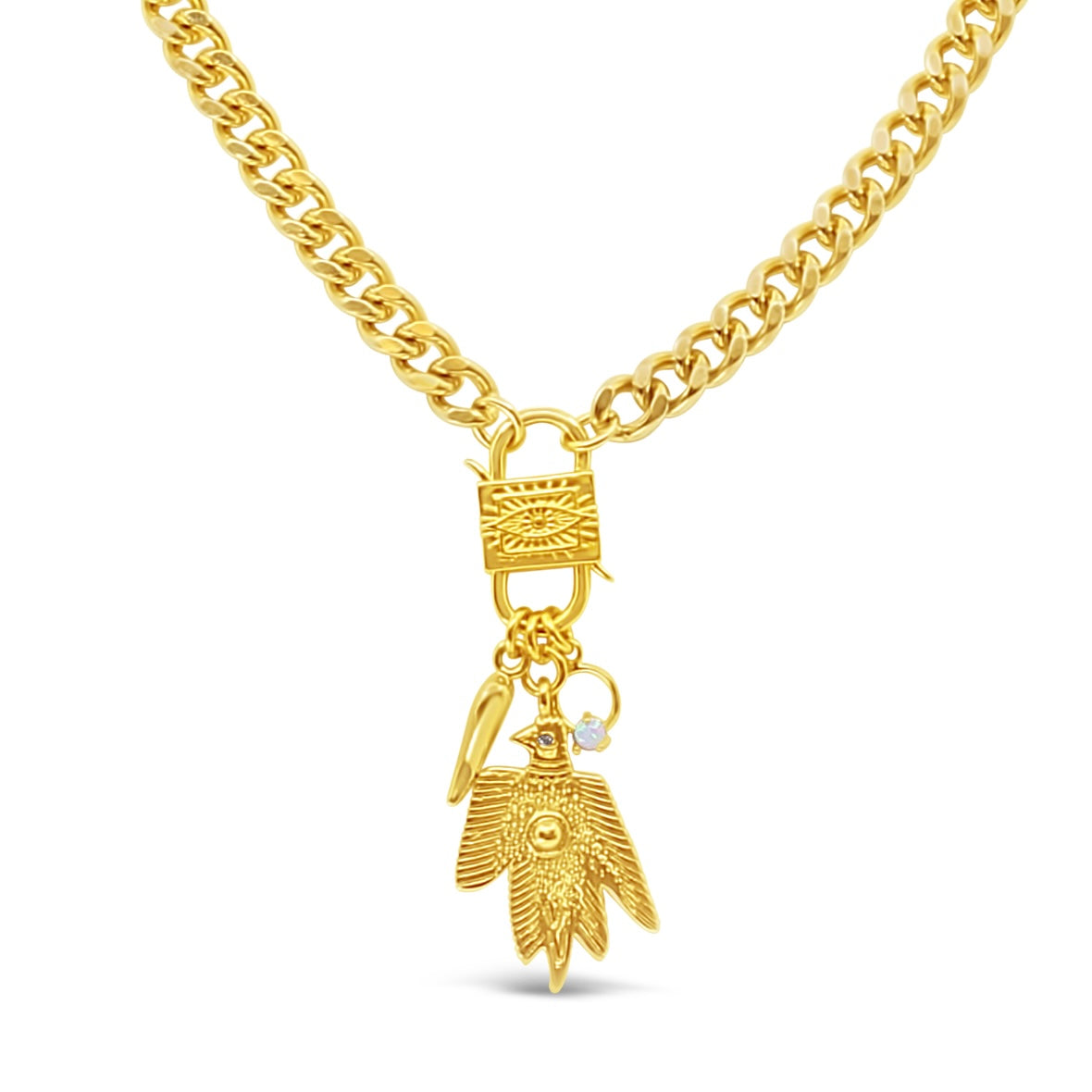 Eagles symbolize freedom, opals represent protection, and the Corno horn wards off the evil eye.