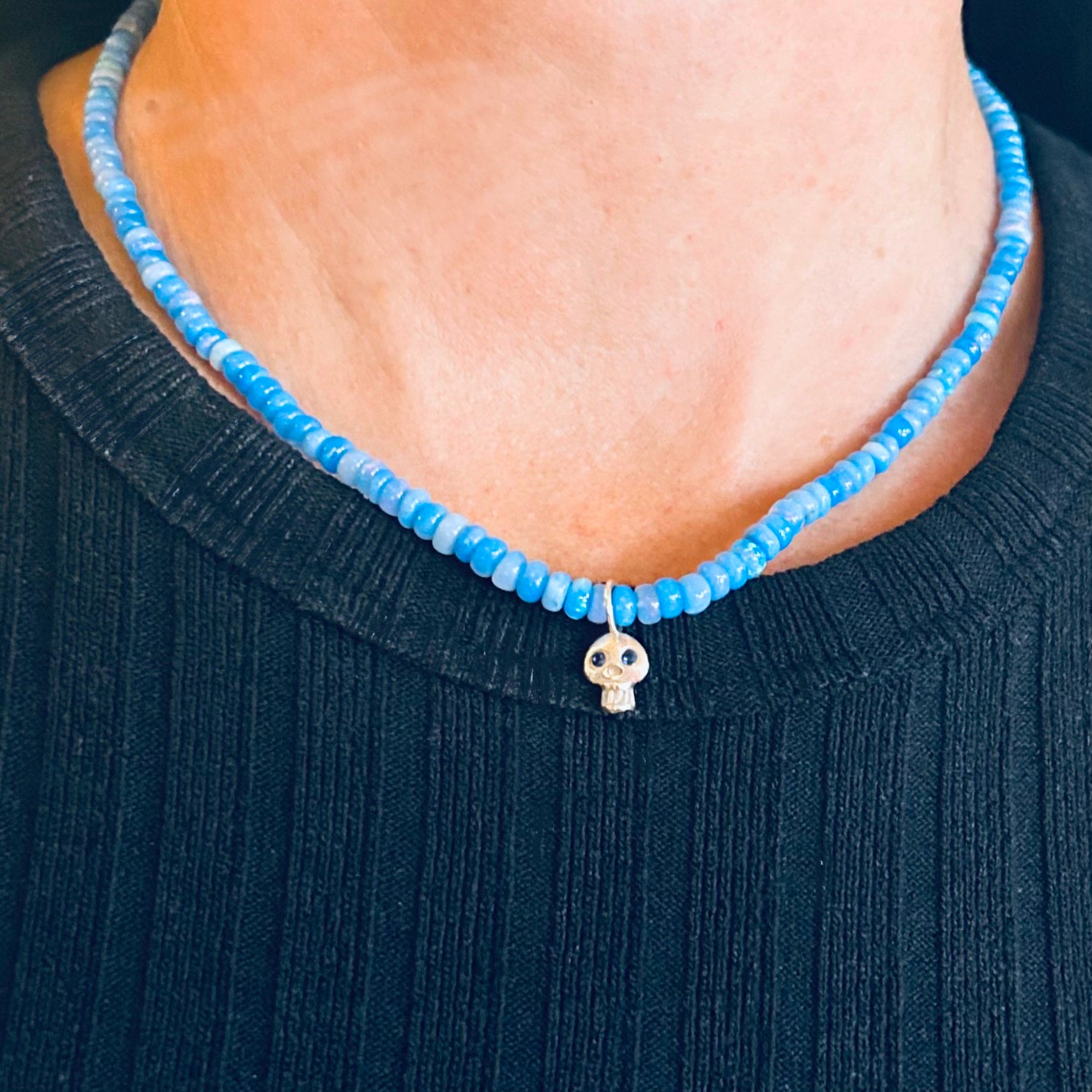 A stunning strand of vibrant blue opals with a lovable smiling skull charm, an edgy and refined combination. Skulls are powerful symbols, representing transformation, wisdom, and a reminder of life’s fleeting nature. Cast in Sterling Silver with Sapphire eyes and a topaz smile this cheeky charm reminds us to live life to its fullest everyday.