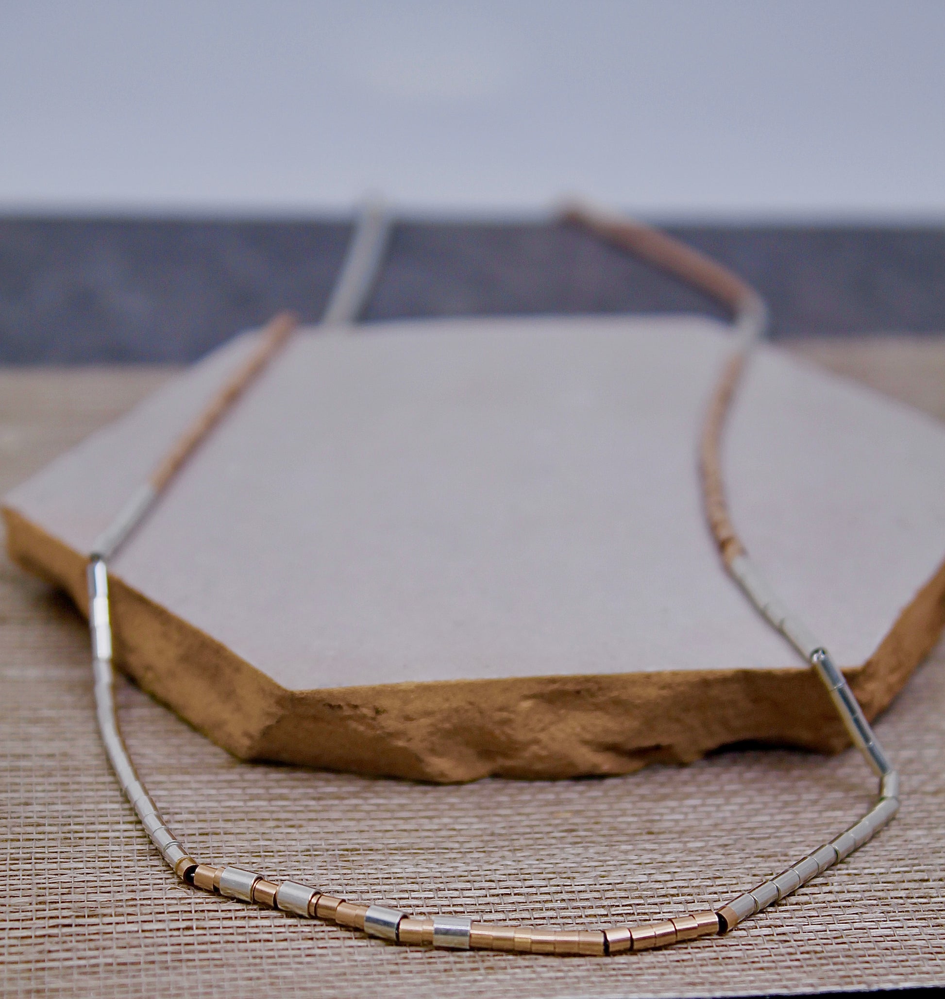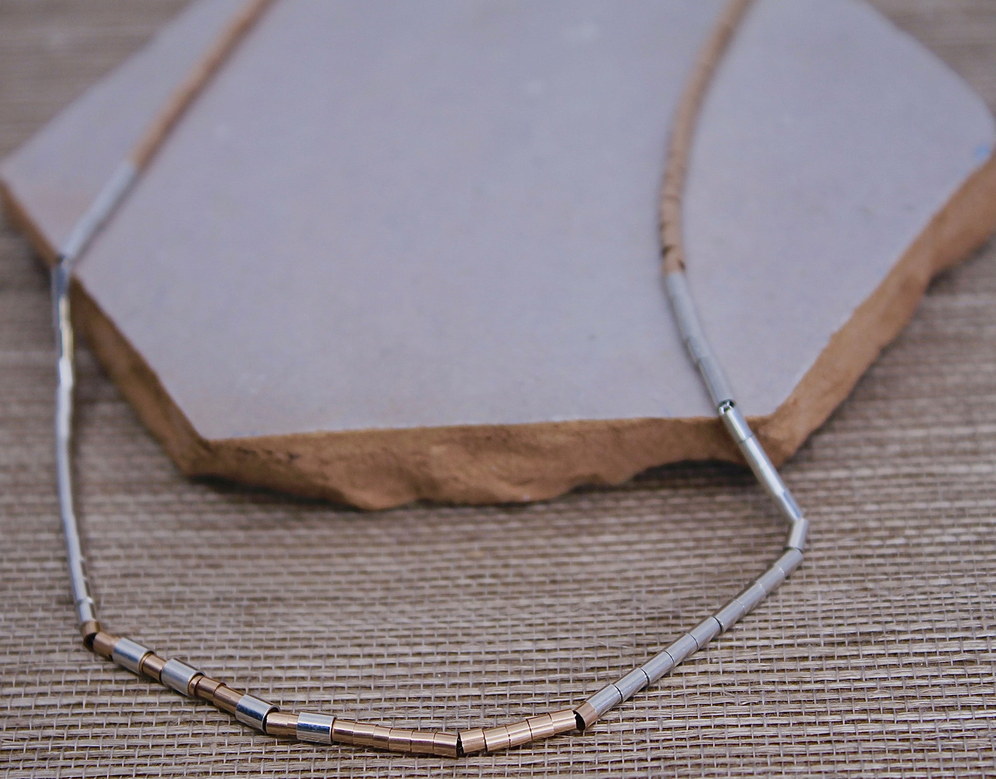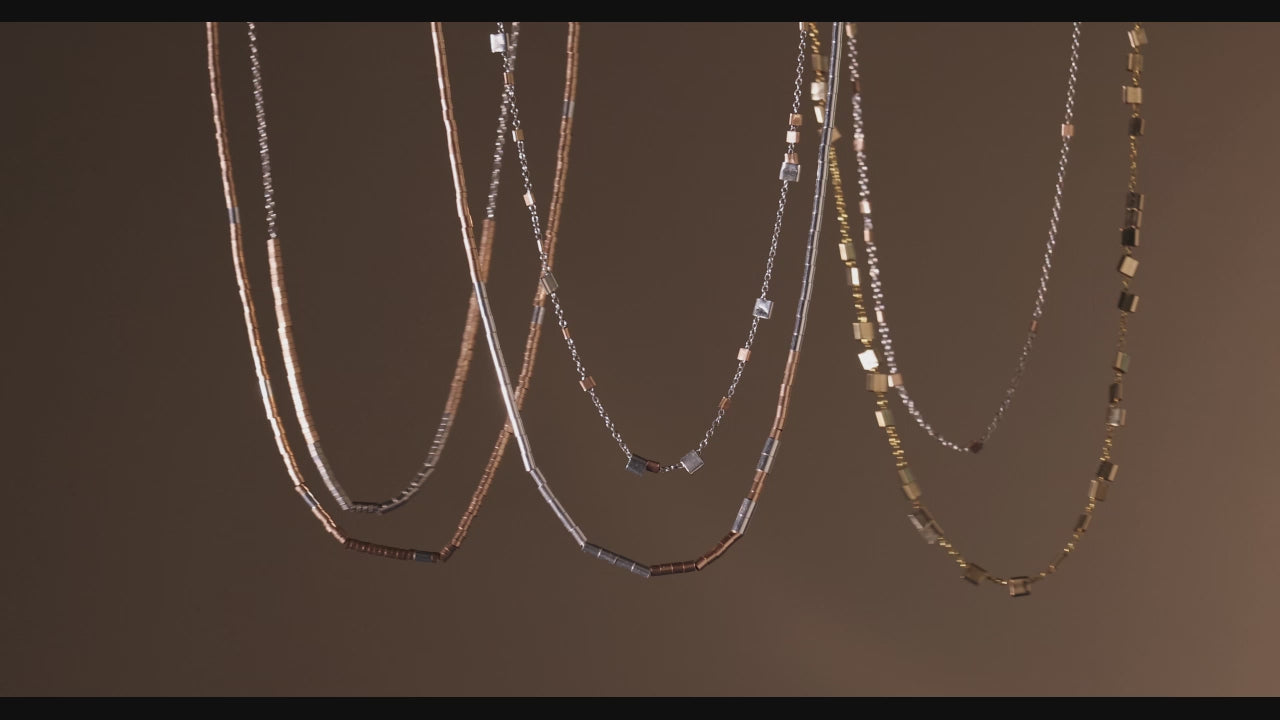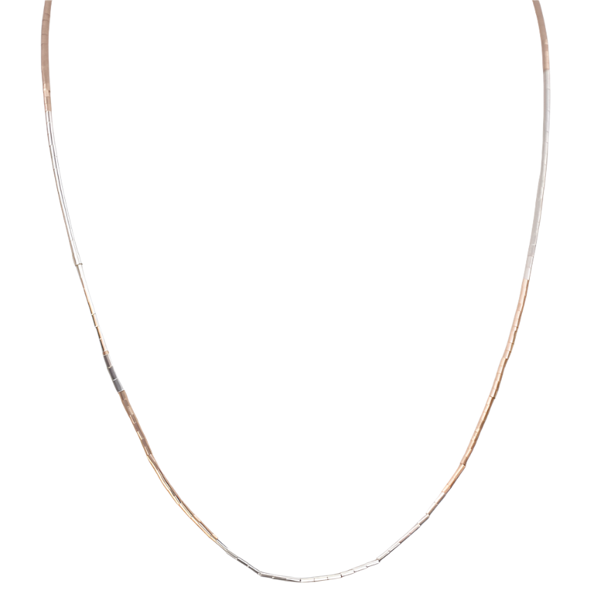This delicate one of a kind chain features hand-beaded tiny rose gold and silver beads, alternating in perfect harmony. The subtle interplay of warm and cool tones creates an unexpected contrast with tiny beads that glimmer on your skin.
