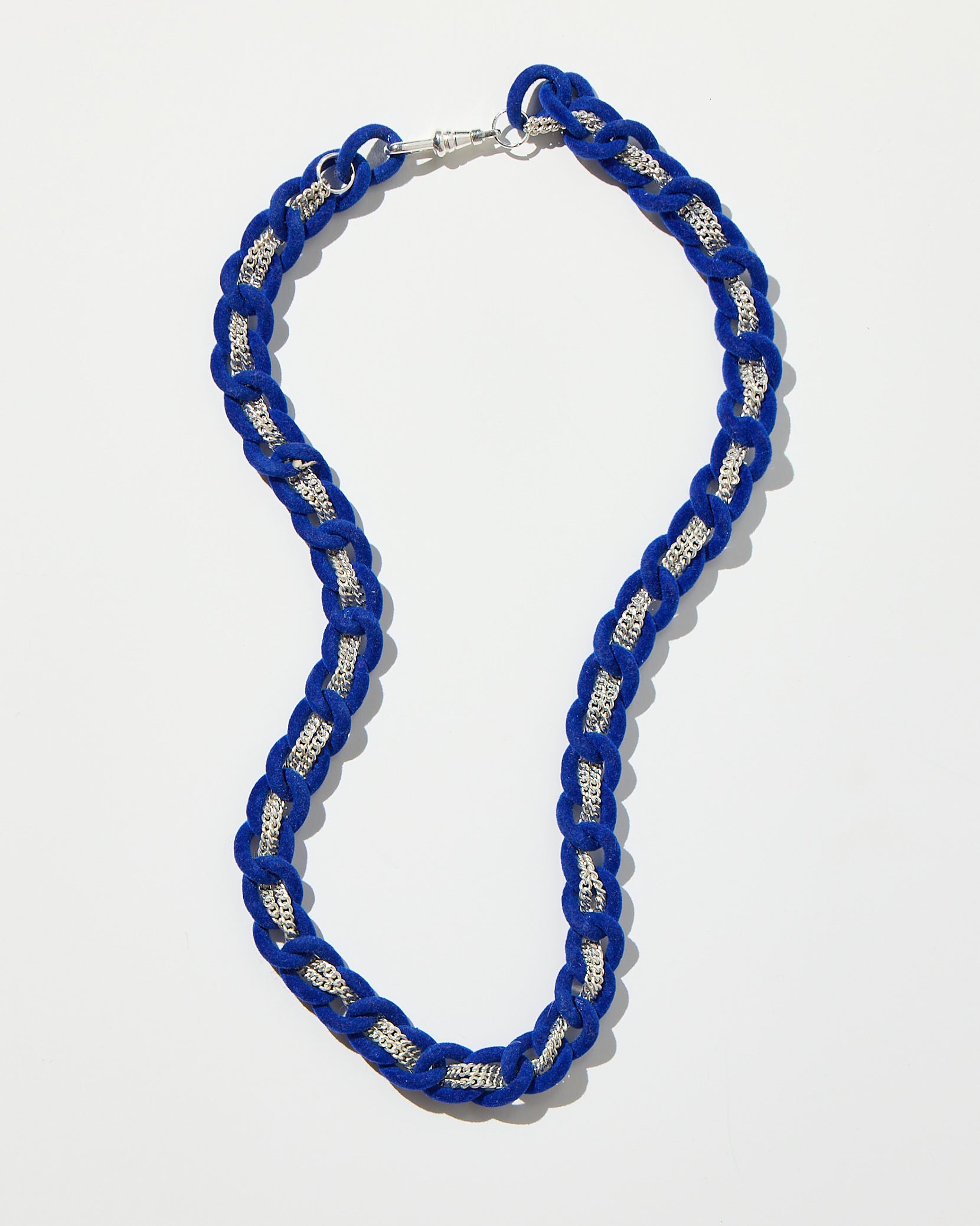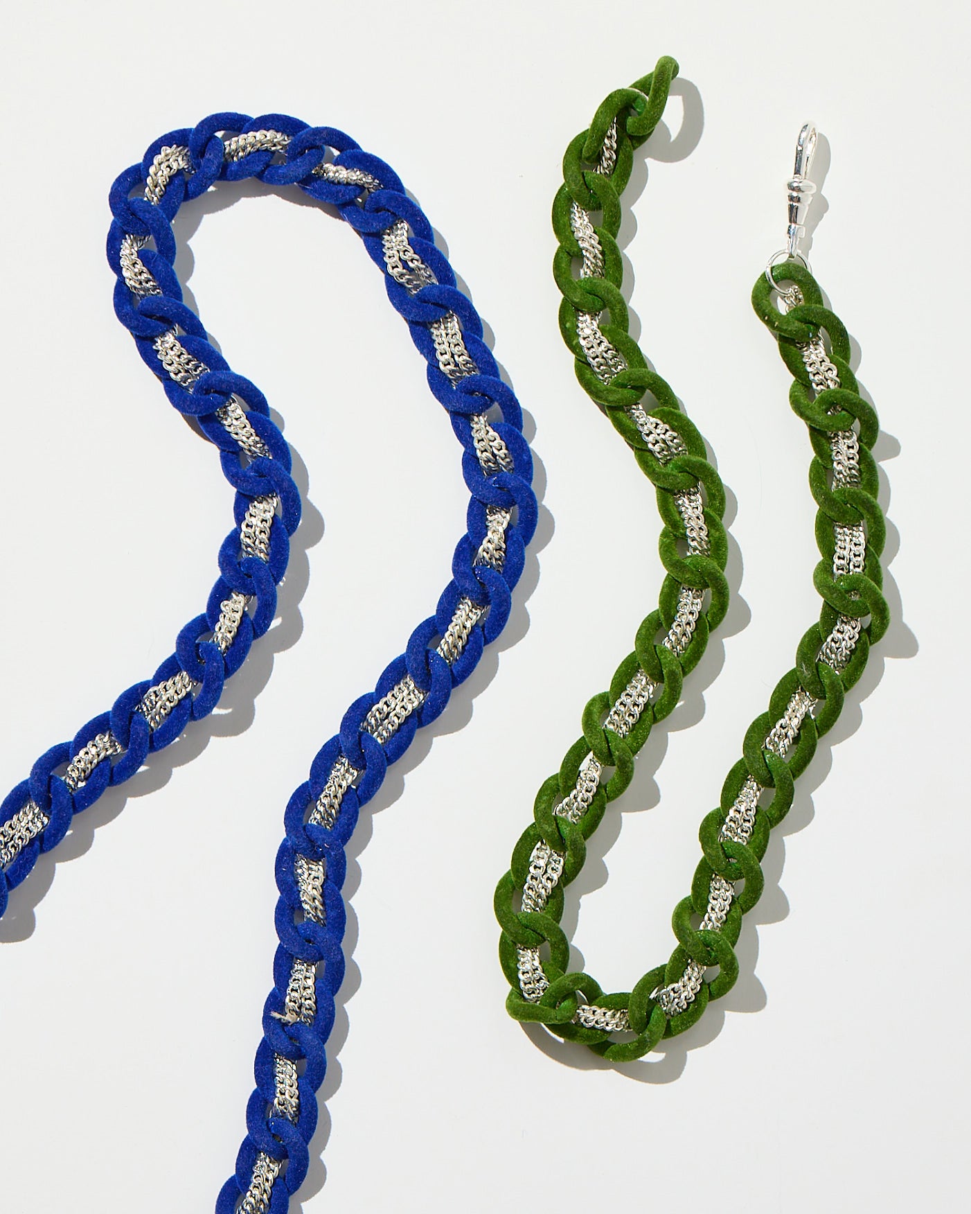 With your choice of a vivid hue and the unexpected mix of textures, the Joan necklace transforms a classic chain into a striking work of art. Smooth flocked links embrace gleaming silver curb chains, creating a bold yet wearable design that’s both modern and timeless.