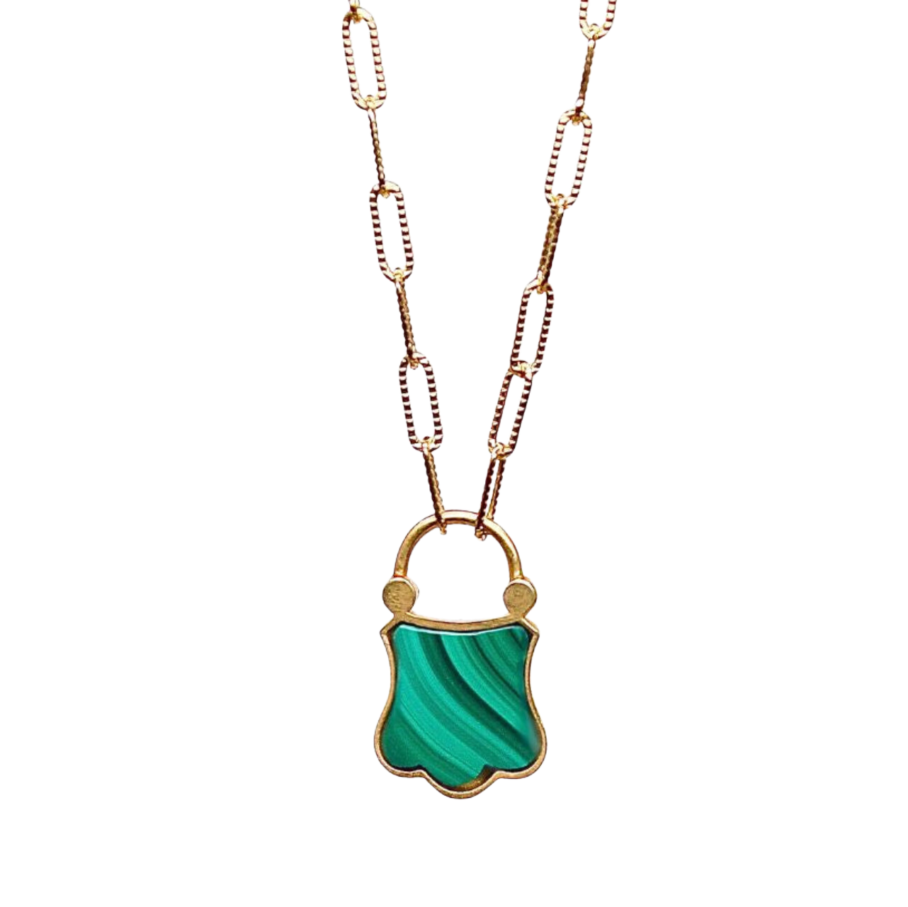 Rich in symbolism and style a Malachite stone is carved and set into the face of the padlock while the back is and engraved with the Latin phrase Amore Fati. The padlock represents love and security, malachite is considered the stone of transformation, and Amore Fati means a love of one’s fate.