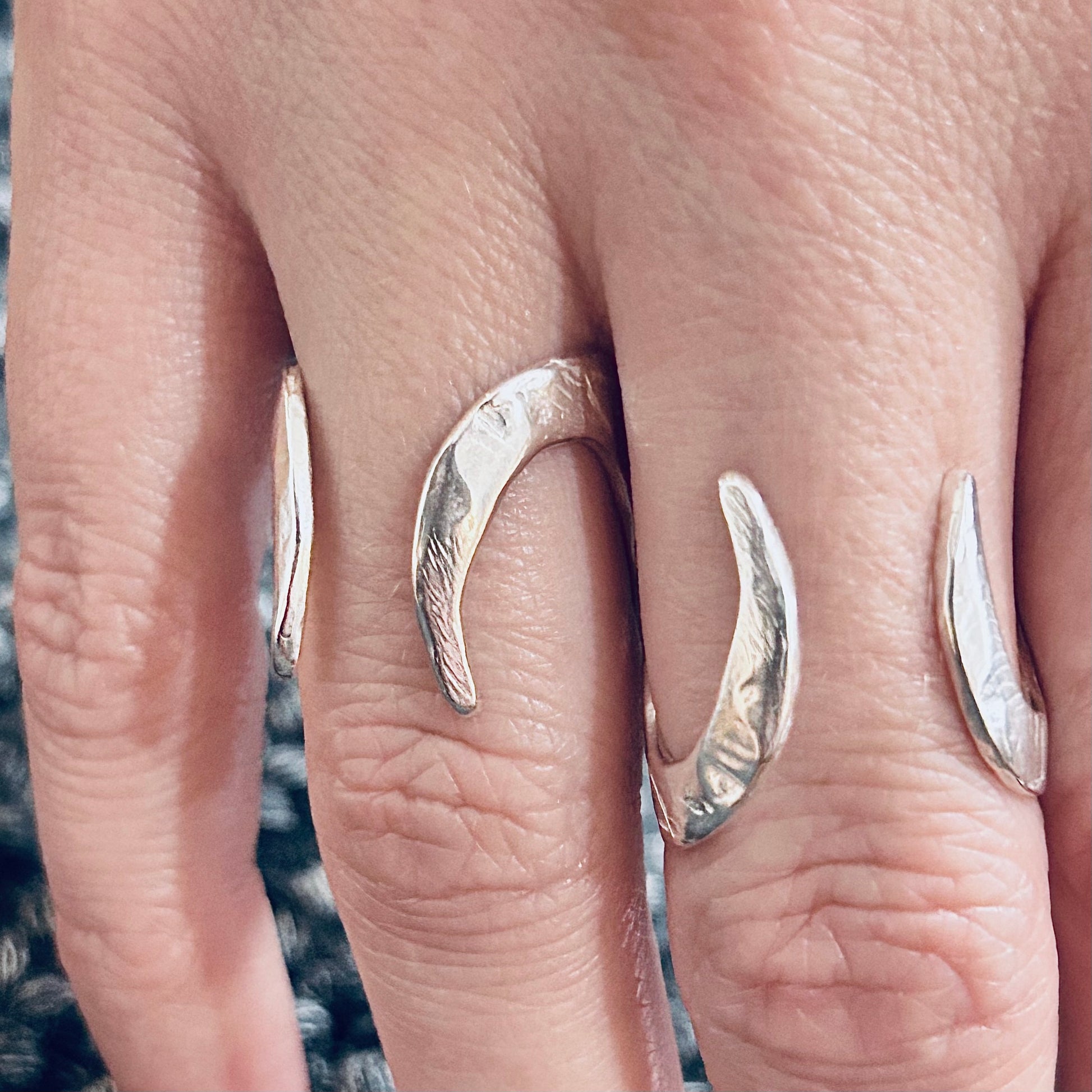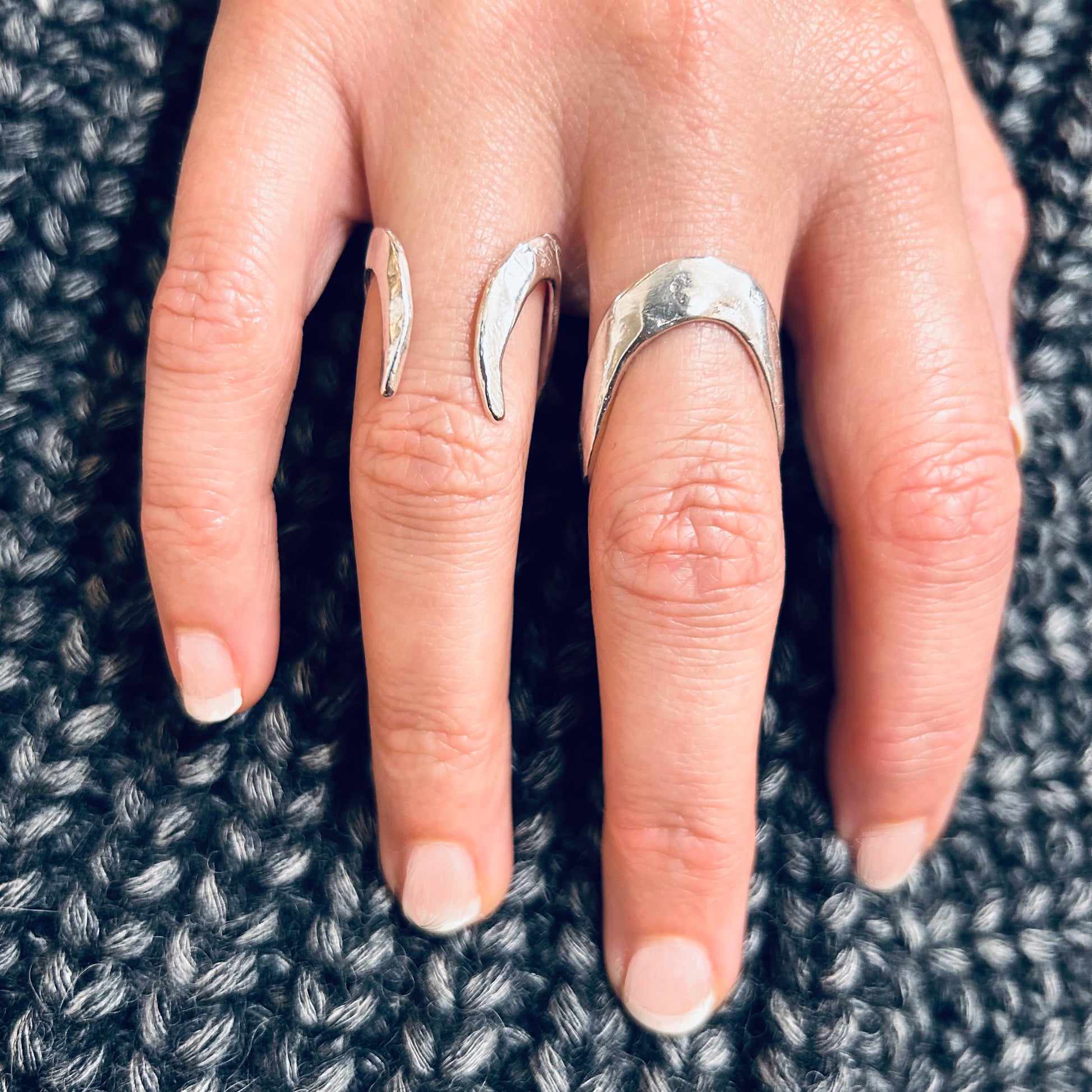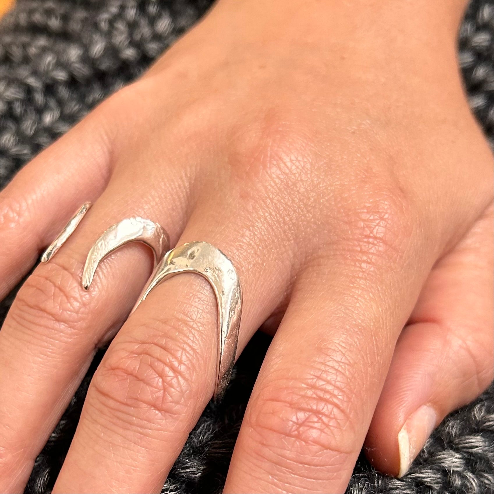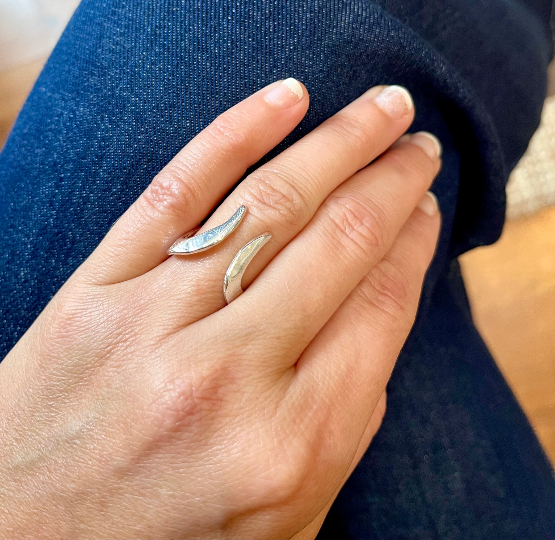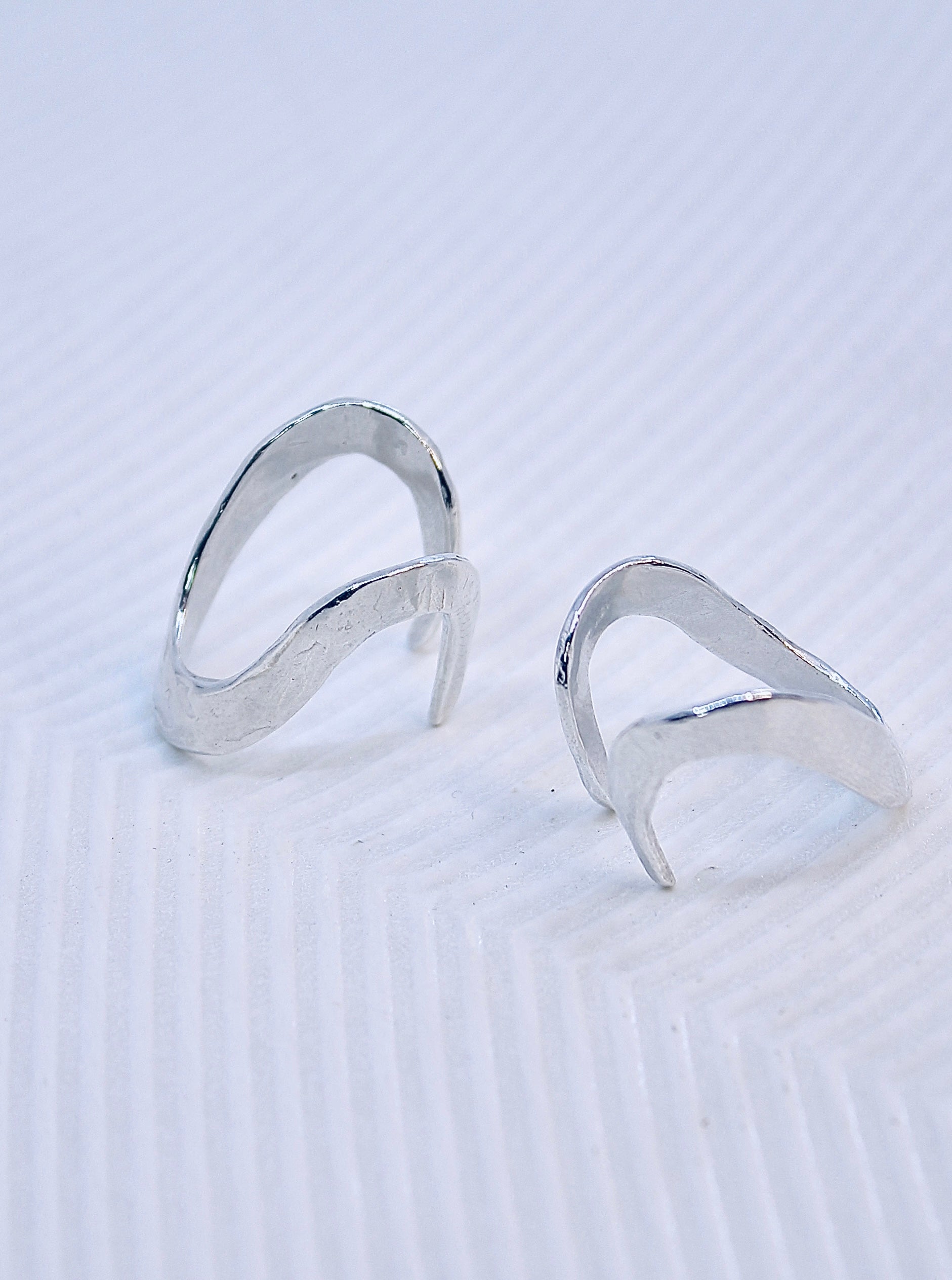 The Meander Ring is inspired by the beauty of a flowing river. Hand formed in sterling silver with a subtle tactile texture, soft fluid lines and curves embody the gentle flowing movement of a river. These rings appear to float effortlessly on your finger and can be worn individually or nestled together for a striking stacking effect, creating a bold negative space that feels as natural as it is elegant.