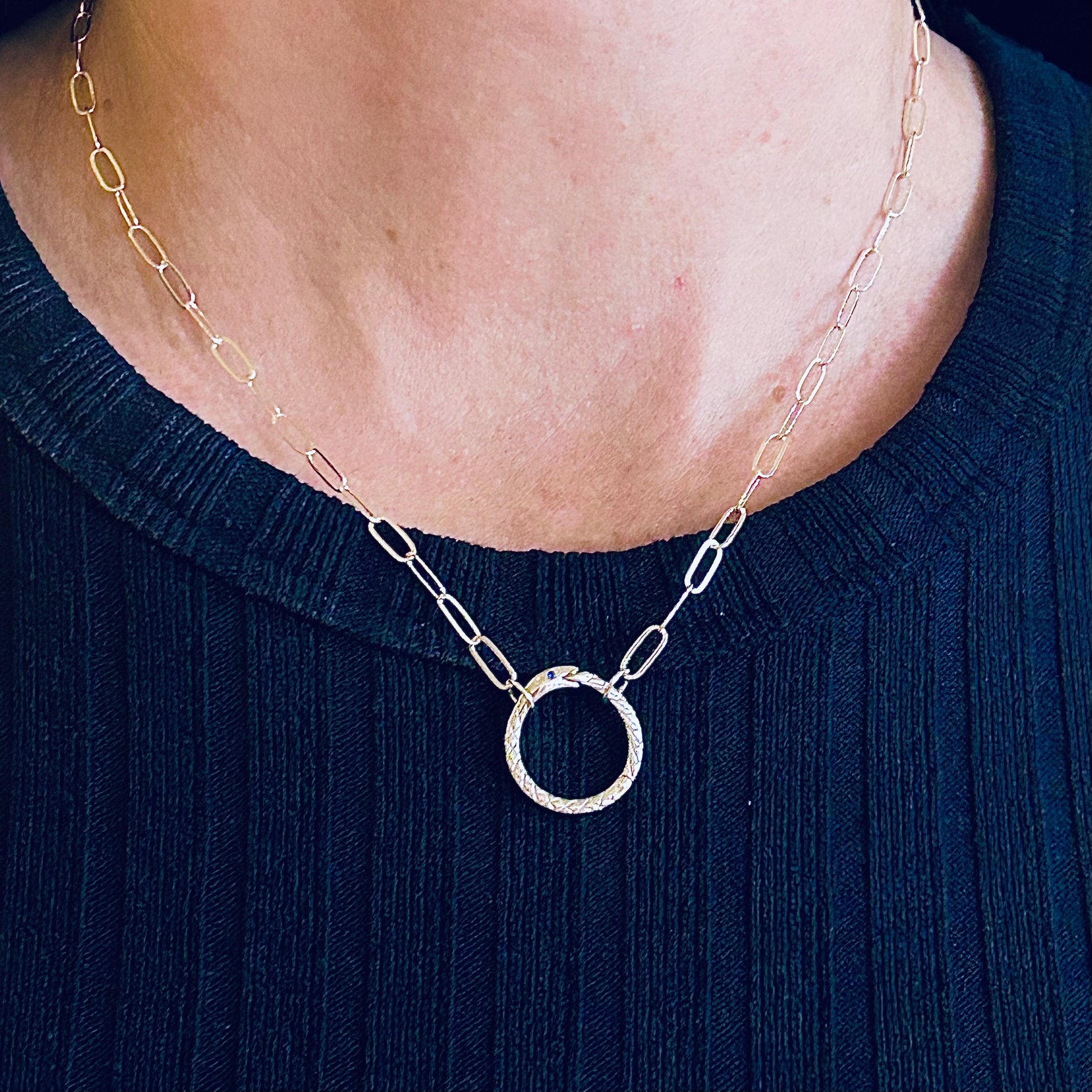 Inspired by the untamed beauty of nature, the Ouroboros Necklace captures the sleek, sinuous grace of a snake biting its tail an ancient symbol, representing the circular process of an alchemist's work.