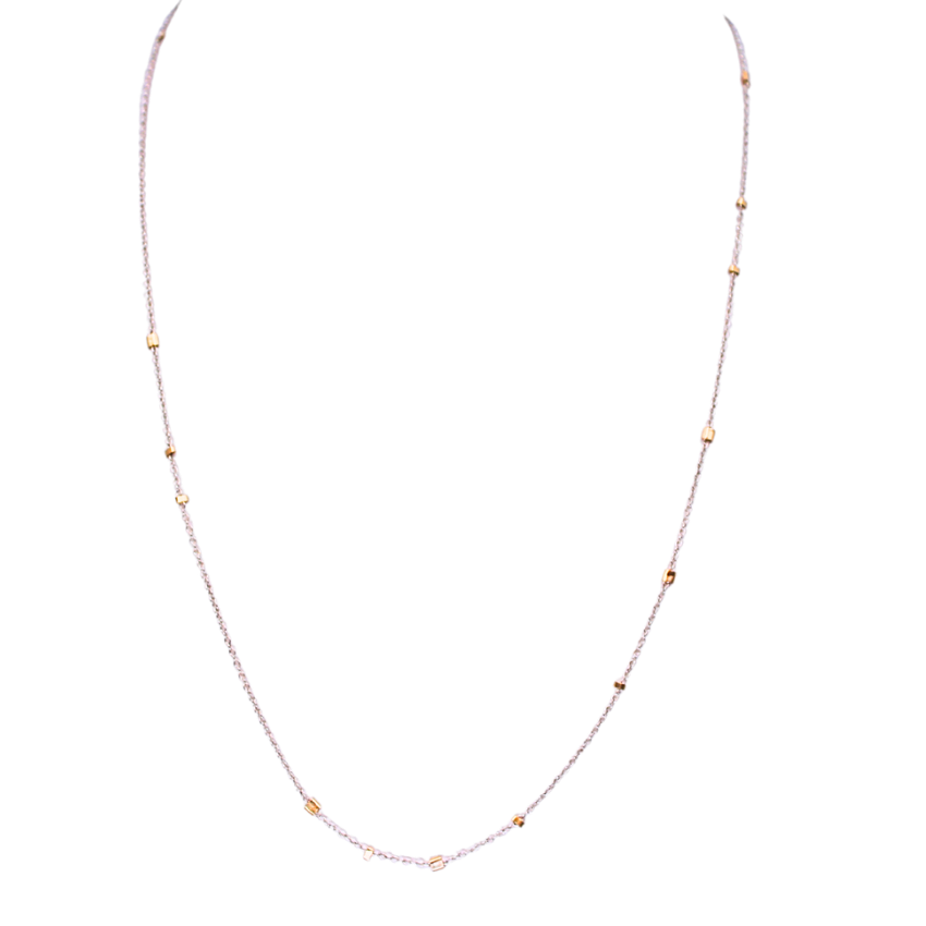 Our Sebastian Chain is simplicity at its finest. Made by hand tiny organic flecks of 14k gold alternating in size are placed along a fine sterling chain. Effortlessly wearable, it’s the perfect elevated basic that catches the light, adding a subtle shimmer to any outfit.