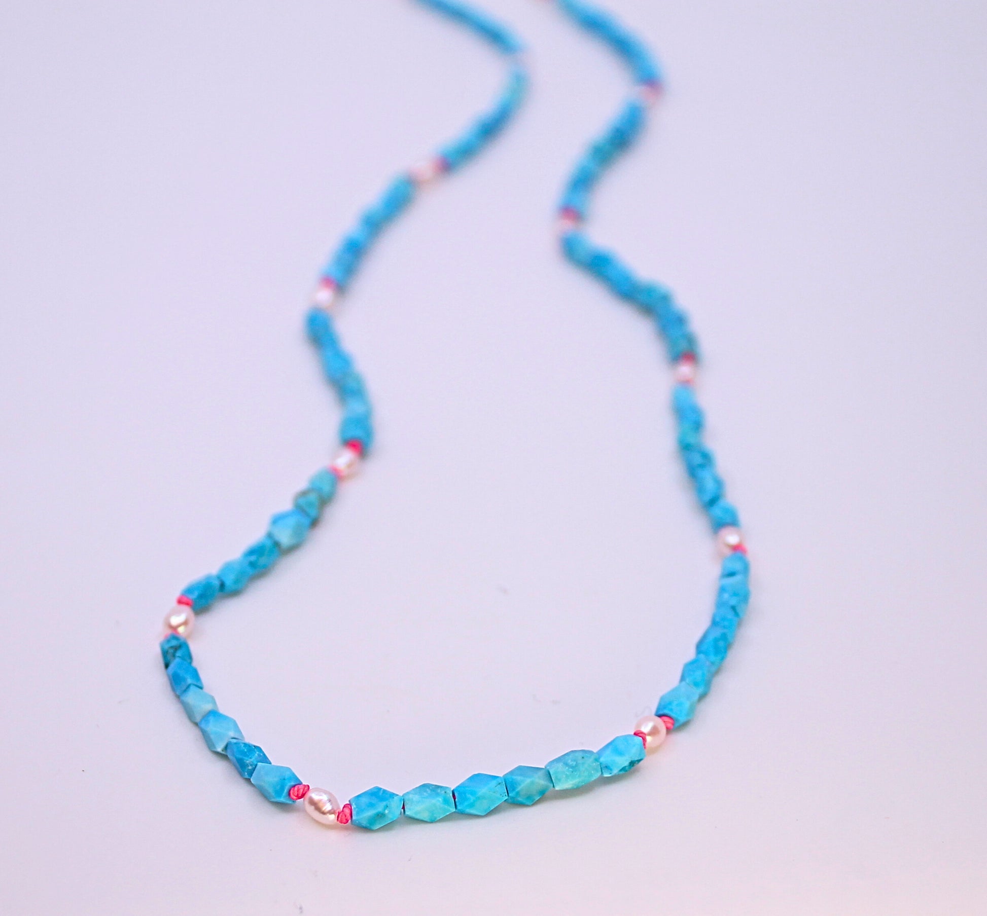A quiet riot of color and charm the Electric Lady necklace has vibrant hues of blue faceted turquoise paired with creamy freshwater pearls strung up on electric pink silk. The perfect mix of elegance with a touch of edge.